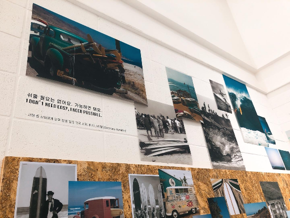 곳곳에 서핑과 관련된 명언이 함께한다. 들어가자마자 서핑하다 죽은 사람의 명언을 딱 하고 접하는데 충격적이었다.. 시몬스 테라스에 처음 와봐서 서핑에 관한 갤러리인 줄 몰랐는데 대뜸 죽음에 관한 문구가 나와서 생뚱맞았다.