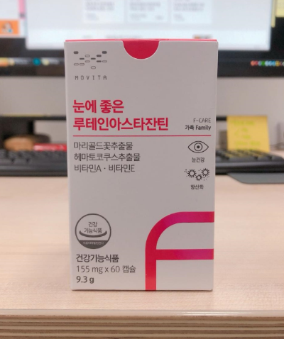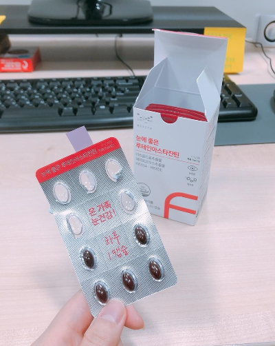 패키지 디자인 아주 이쁘고 알약 크기도 맘에든다! '눈에 좋은 루테인아스타잔틴'은 눈 건강과 관련된 비타민A와 비타민E도 함께 섭취할 수 있어서 따로 종합비타민을 챙기지 않아도 되서 좋다. 지용성 약이기 때문에 더 효과적인 흡수를 위해 항상 점심 식사 후에 바로 섭취하고 있다. 하루에 한 알만 섭취해도 되니 간편해서 좋다.