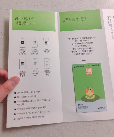 이것이 도착한 광주사랑카드다ㅎㅎ 나는 평소에 개구리카드라고 부른다. 지역마다 지역화폐카드 디자인이 다른 것이 독특하고 신기하다. 광주사랑카드가 디자인이 제일 나은게 뭔가 자랑스럽다. 지역 특징을 잘 보여주고 디자인에 신경을 쓴 느낌이 든다.