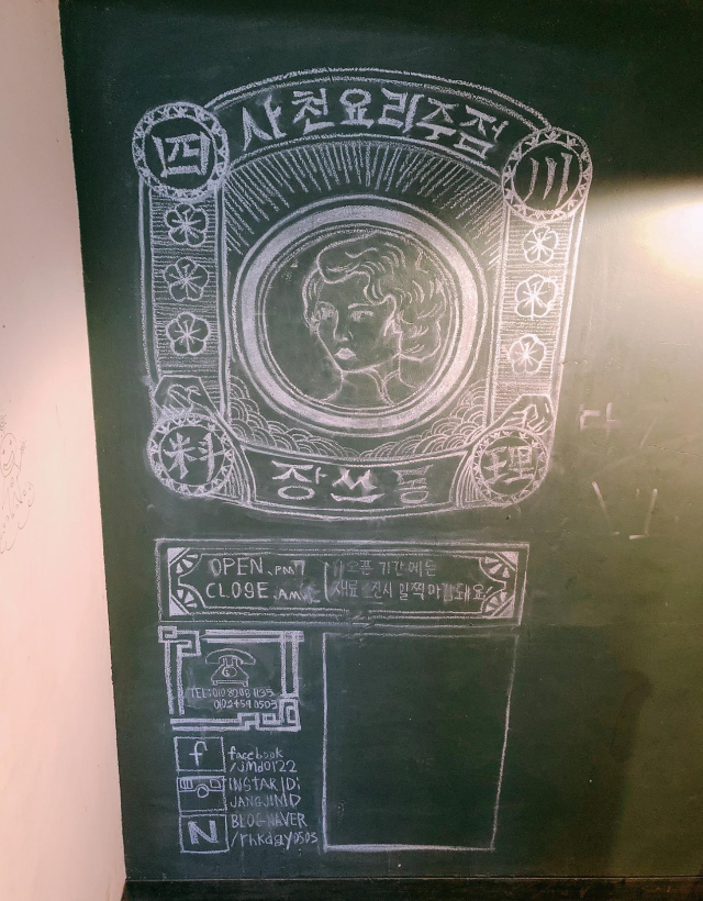 지하로 나있는 계단을 내려가면 칠판으로 된 벽에 간판에 있는 것과 같은 일러스트가 분필로 그려져 있다. 각종 SNS 계정을 써 놓아 홍보도 하고 있다. 저 빈 공란은 무엇을 쓰는 용도일까? 화려하면서 투박한 그림이 첫 방문을 반겨주었다.