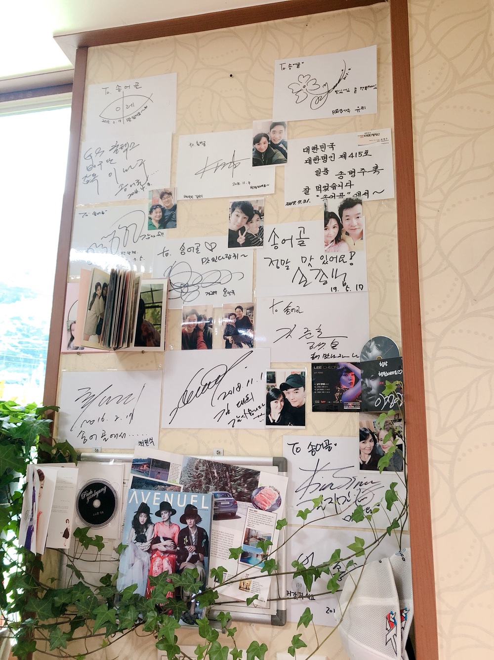 가게에 들어가자마자 한쪽 벽면에 잘 먹고 갔다는 메세지와 함께 사인들이 붙여져 있습니다. 당시엔 그냥 사진만 찍어서 몰랐는데 지금 보니 아는 연예인이 몇 있네요.