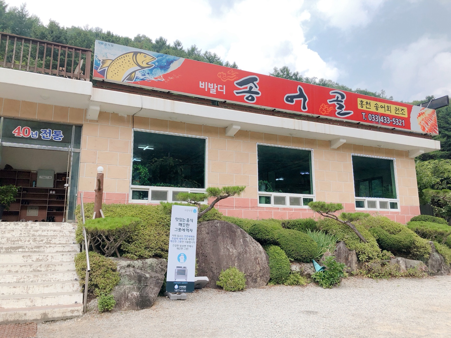 오션월드에서 물놀이를 하고 다음날 어떤 특별한 것을 먹을까 고민하다가 주변에 괜찮은 송어 요릿집이 있다 해서 송어를 먹기로 결정했습니다. 송어는 직접 잡아서 한 토막 구워 먹어 본 적이 있는데 이렇게 송어 전문점에 와서 사 먹는 것은 처음입니다. 제가 방문한 곳은 '송어골'이라는 식당입니다. 40년 전통을 가지고 있는 송어회 원조집이라고 하네요.