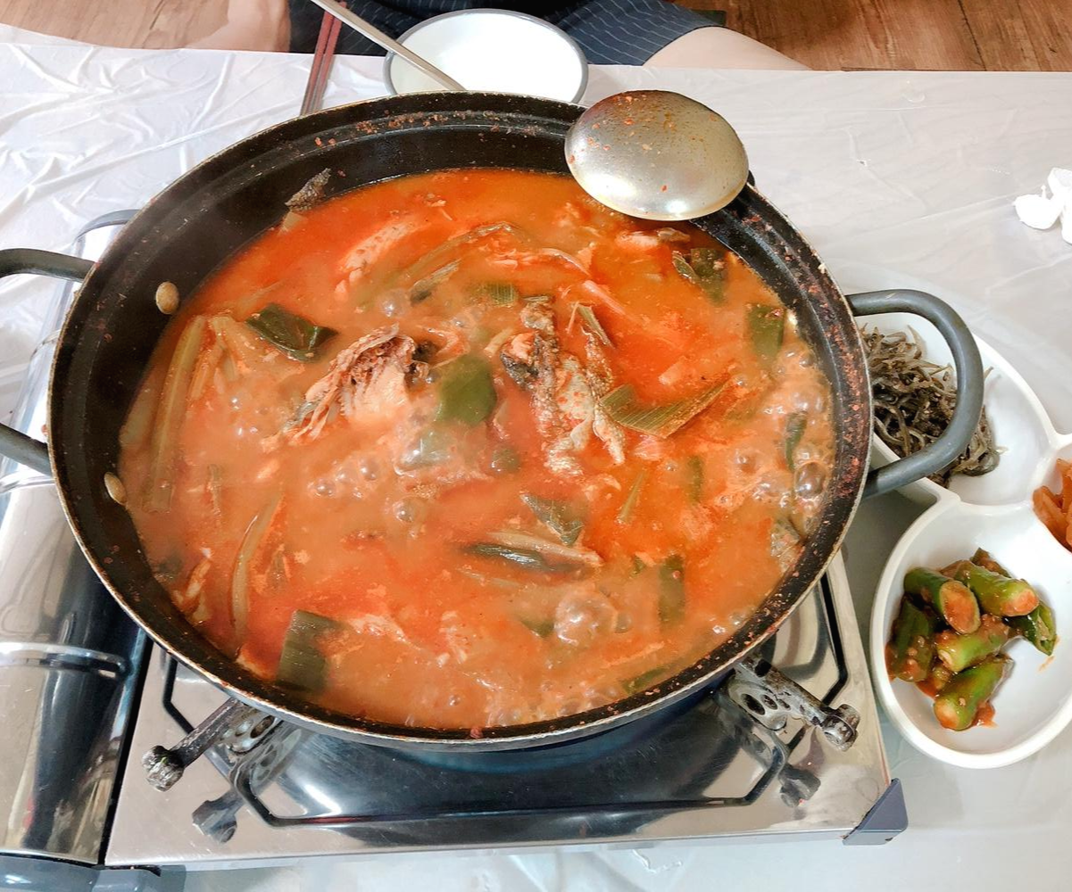 송어회를 다 먹고 그 뒤에 송어매운탕이 나왔습니다. 국물이 평범한 매운탕과 같았습니다. 남자 친구와 이 안에 수제비 있으면 맛있겠다고 하면서 냠냠 먹었습니다. 살을 발라먹기에는 좀 적고 애매했는데 그 때 이모님이 또 달려오셔서 송어 매운탕 먹는 방법을 알려주셨습니다. 국자로 송어대가리와 그 외 살들을 꾹꾹 으깨서 약간 어죽같이해서 먹는 거라고 하셨습니다. 그렇게 해서 먹으니 약간 밋밋했던 매운탕에서 풍미가 살아나고 식감이 더 좋아졌습니다. 더 든든해졌다고 할까요?