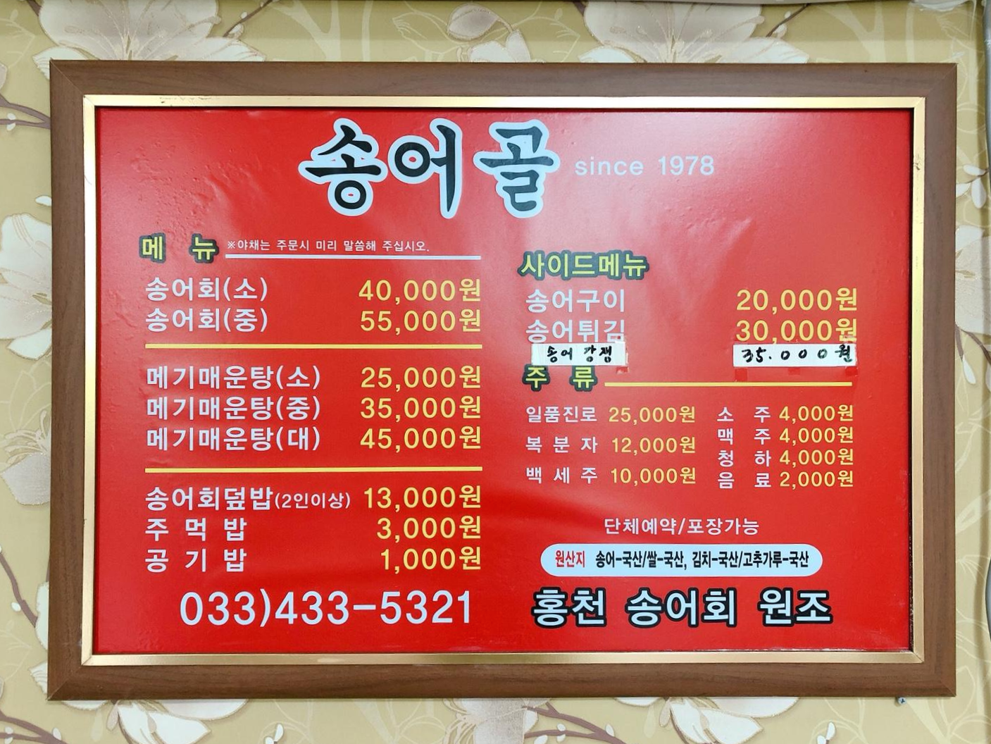 '송어골'의 메뉴입니다. 식사하는 사람들을 보니 거의 송어회를 먹고 그 뒤에 매운탕을 먹고 있었습니다. 참고로 매운탕은 나가면서 결제 시 SNS에 지정된 해시태그를 하고 게시를 하면 무료입니다.