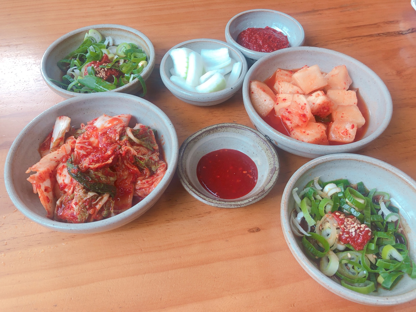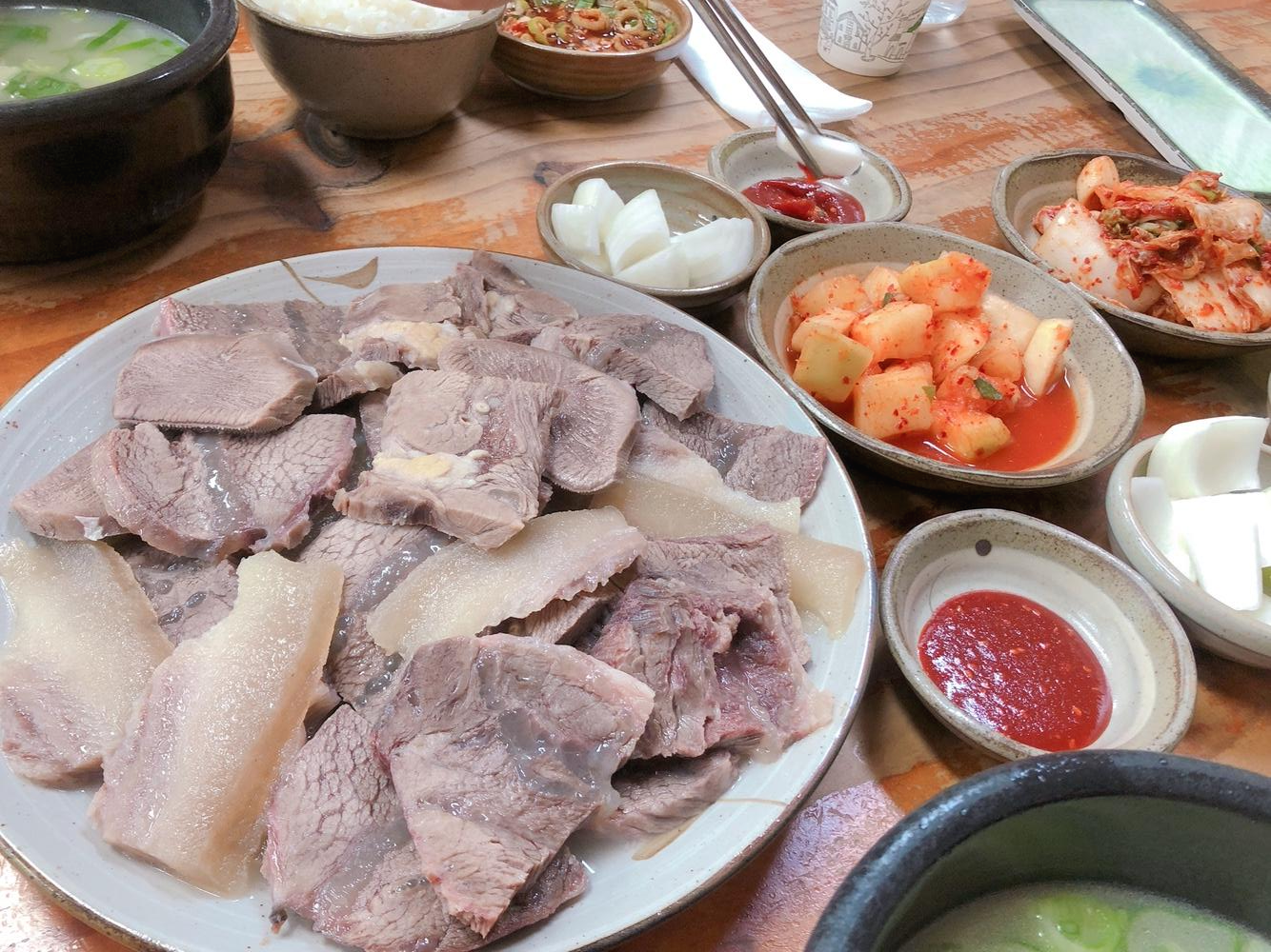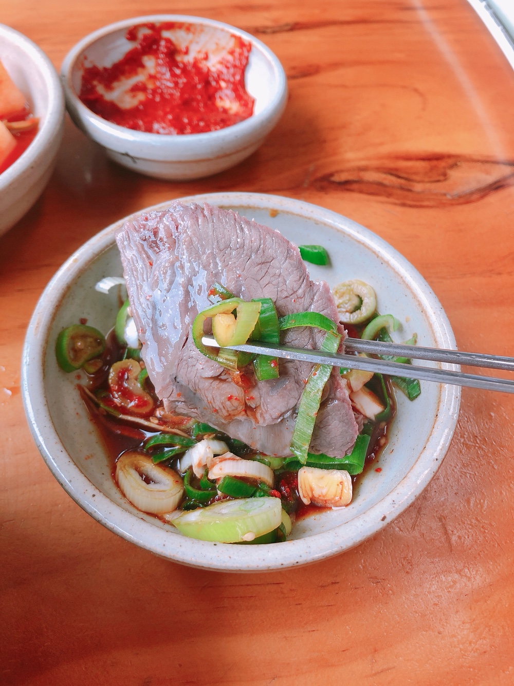 기본 상차림. 겉절이 김치와 깍두기와 고기를 찍어먹는 간장 그리고 양파와 초장이 나온다. 국밥 나오기 전까지 양파를 초장에 찍어서 냠냠 먹어준다. 김치와 깍두기는 사서 쓰지않고 매일매일 담근다고 한다. 맛있어서 다른 테이블을 보니 한 번씩 리필은 필수로 하는 것 같다.