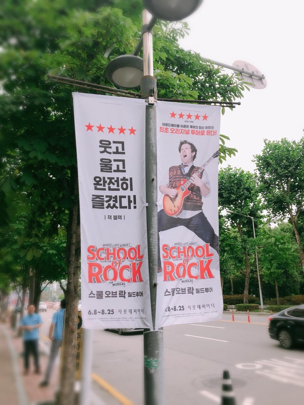 드디어 뮤지컬 스쿨 오브 락을 보게 되었다! 비록 새벽 출근해서 피곤하고 짜증 났지만 스쿨 오브 락을 볼 거기 때문에 기대되고 기분이 좋았다. 샤롯데씨어터 들어가기 전에 가로등 배너를 보고 한번 더 흥분했다. 드디어 보는구나!