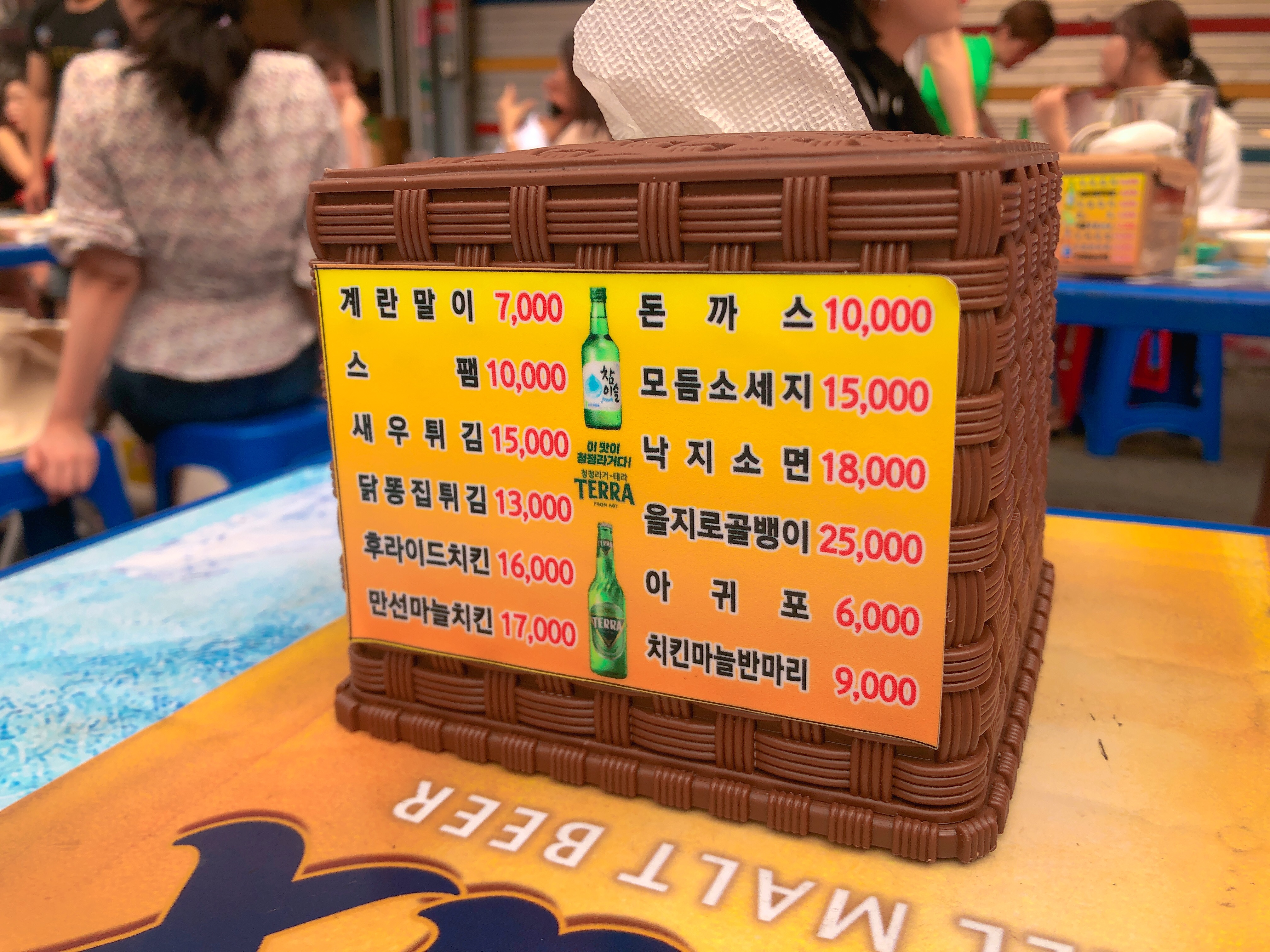 메뉴는 티슈각에 앞뒷면으로 있다. 날이 더워서 입맛이 없었으므로 노가리 2개와 생맥주 2잔을 시켰다. 생맥주 3,500원, 노가리 1,000원으로 총 9,000원 나왔다.